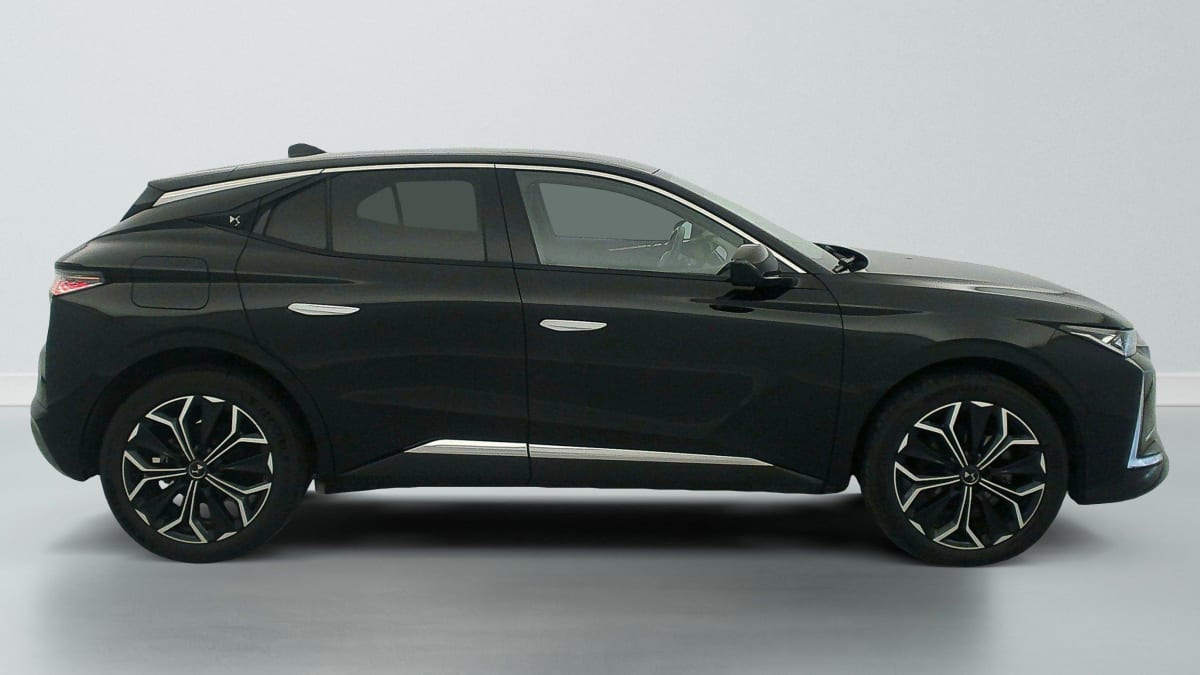 intérieur cuir grainé noir basalte et toile ds : ciel de pavillon clair décors de panneaux de porte chrome guilloché volant en cuir fleur mistral console centrale en toile ds mistral planche de bord en toile ds noir basalte façon écaille panneaux de portes en toile ds noir basalte façon écaille sellerie en cuir grainé noir basalte et toile ds