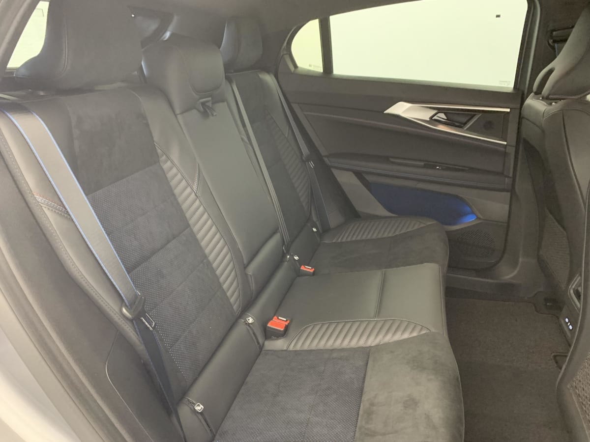 Sellerie mixte Alcantara avec surpiqûres bleues et logo Alpine lumineux